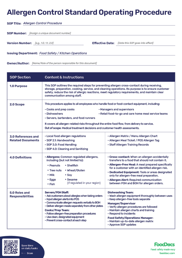 A standard operating procedure for allergen control is part of both a food safety plan and a legal safeguard. It sits at the core of your food safety system alongside your HACCP prerequisites. When you follow it every day, people with allergies can safely eat your food and build trust with your brand.