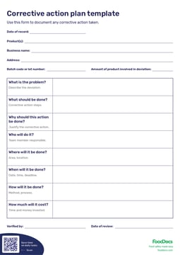 Your corrective action form should also include basic information such as the date of record, defective product(s), business name, address of the business, batch code or lot number, and the amount of product involved in the deviation (i.e., non-conformance).