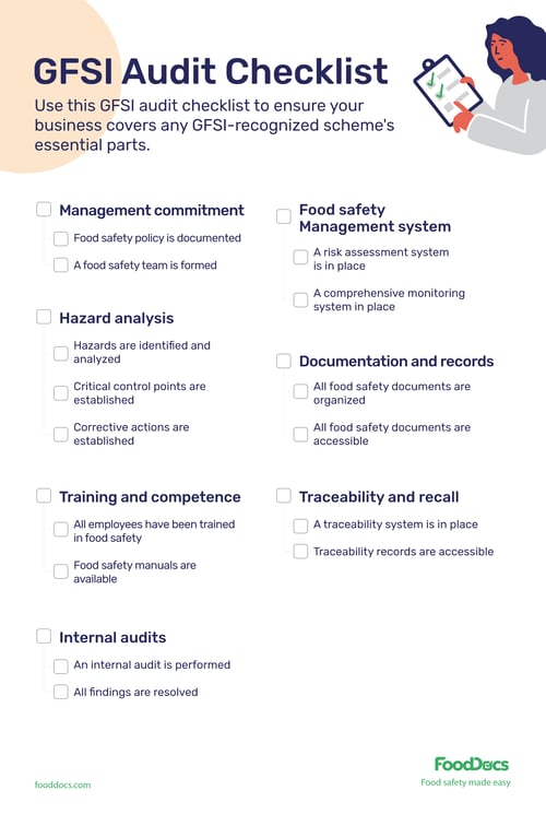 - The findings from a GFSI audit checklist can be used to improve your food safety operations according to the requirements of GFSI-recognized schemes.
