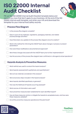 Our ISO 22000 internal audit checklist includes questions under the following categories: