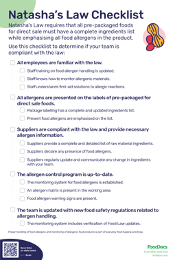 - Legal compliance. A Natasha's Law checklist can help you evaluate your business's level of compliance. It can be used to determine if your business takes all the suggested precautionary measures and complies with food labelling regulations.