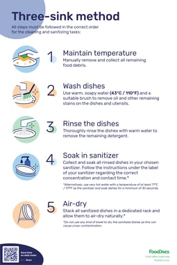 Properly using a 3-compartment sink ensures your kitchen adheres to health codes and maintains high sanitation standards. Download the three-sink method poster above to help your team always remember how to wash dishes in a 3-compartment sink safely and effectively.
