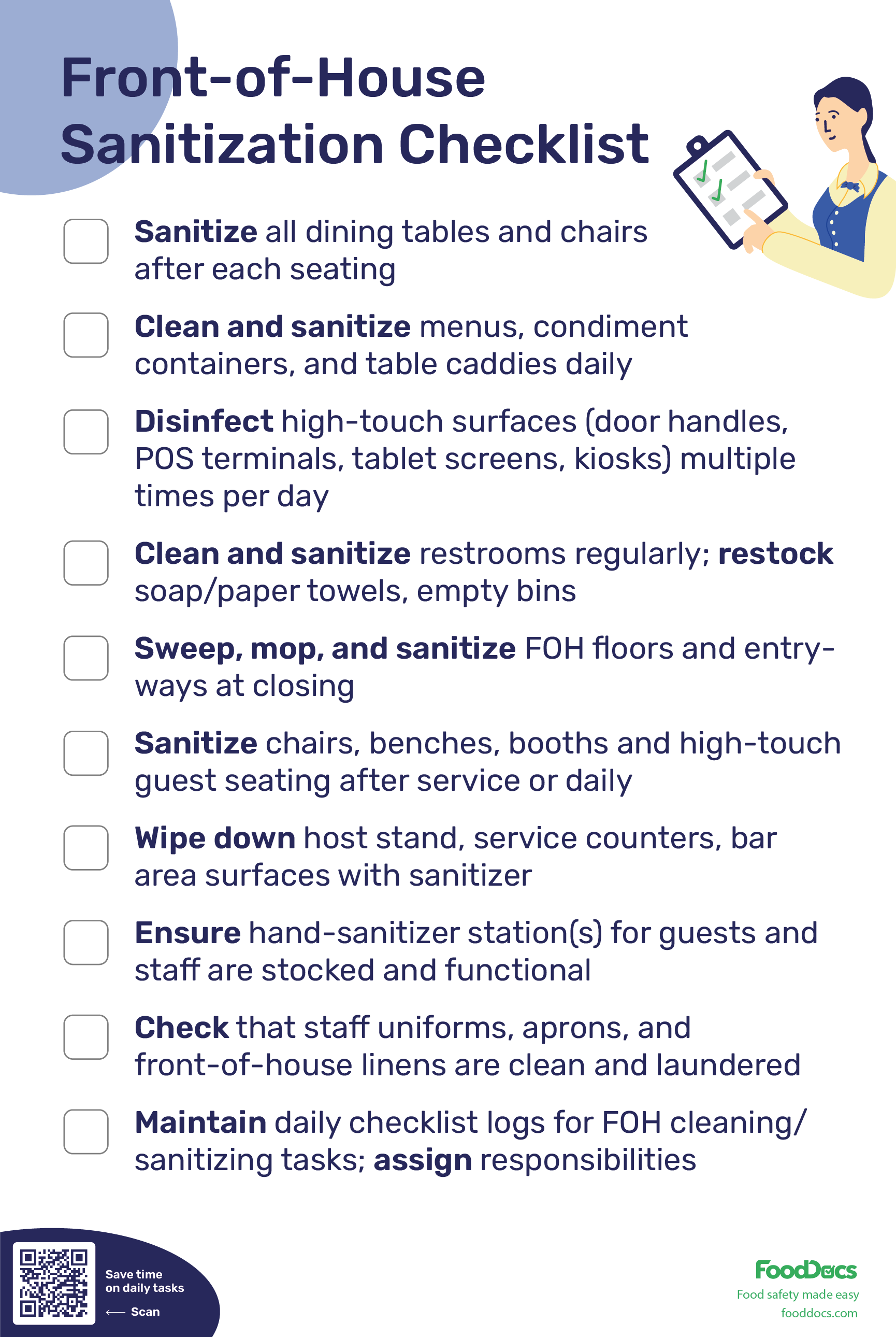 Here's an example front-of-house daily sanitizing checklist with essential tasks: